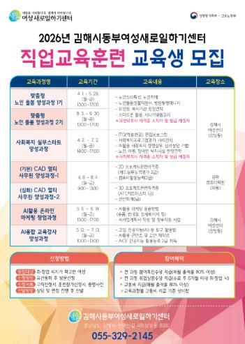 올해 직업교육훈련 과정은 ▲맞춤형노인돌봄 양성과정 1기, ▲사회복지실무스타트 양성과정, ▲(심화)CAD멀티사무원 양성과정, ▲AI활용온라인마케팅 창업과정, ▲AI융합교육강사 양성과정, ▲맞춤형노인돌봄 양성과정 2기, 총 7개 과정으로 4월 1일 개강하여 9월 30일까지 순차적으로 운영한다.
