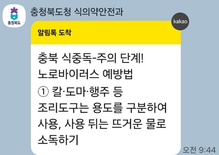 뉴한국방송뉴스통신사 권영분기자 기자 | 충북도는 안전한 먹거리 환경조성을 위해 2월 4일부터 도내 집단급식소, 뷔페, 대형음식점, 계절별 음식점을 대상으로 식중독 지수 및 시기별 식중독 예방 홍보 카카오 알림톡 서비스를 시행한다.