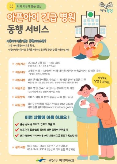 뉴한국방송뉴스통신사 김성의 기자 | 광주 광산구가 3월 1일부터 부모가 곁에 없거나 돌봐주기 어려운 상황에서 갑작스럽게 진료가 필요한 아동을 위한 ‘아픈 아이 긴급 병원 동행’ 서비스를 시행한다.