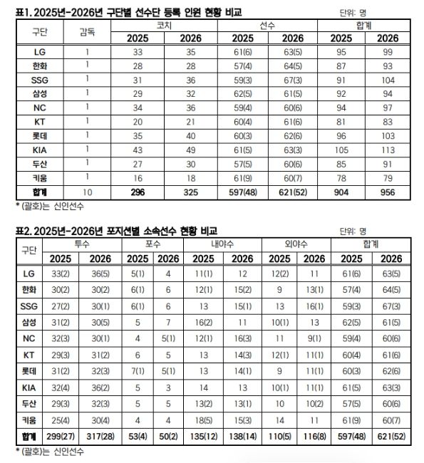 뉴한국방송뉴스통신사 신유철기자 기자 | KBO는 2월 10일(화) 2026년 KBO 리그 소속 선수 명단을 공시했다. 10개 구단은 총 621명의 선수를 등록해, 597명이 등록했던 2025년보다 24명이 늘어났다.