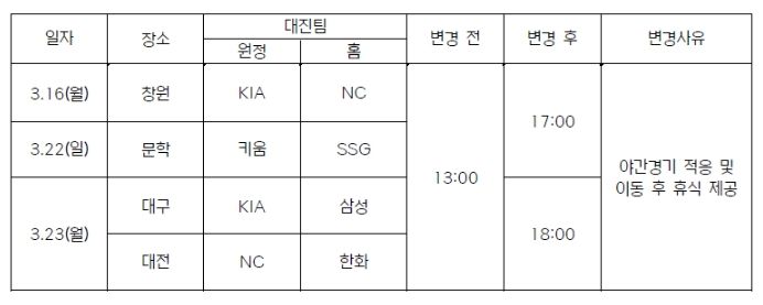 뉴한국방송뉴스통신사 신유철기자 기자 | 2026 KBO 시범경기 중 일부 경기의 개시 시간이 야간경기 적응 및 이동 후 휴식 제공을 위해 변경됐다.
