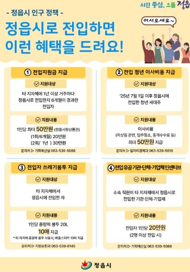 먼저 시는 타 지자체에서 정읍으로 터전을 옮기는 시민들을 위해 전입지원금을 대폭 상향했다. 기존 15만원이었던 지원금을 최대 50만원으로 확대해 전입 후 6개월이 지나면 20만원, 1년이 경과하면 30만원 등 총 2회에 걸쳐 정읍사랑상품권으로 지급한다. 변경된 제도는 2025년 7월 1일 이후 전입자부터 적용된다.