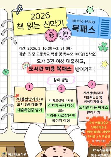 뉴한국방송뉴스통신사 신유철기자 기자 | 부산광역시립해운대도서관(관장 노장석)은 오는 10일부터 31일까지 초·중·고등학교 학생 및 학부모 100명을 대상으로 ‘2026 책 읽는 신학기 응원 북패스’ 행사를 운영한다.