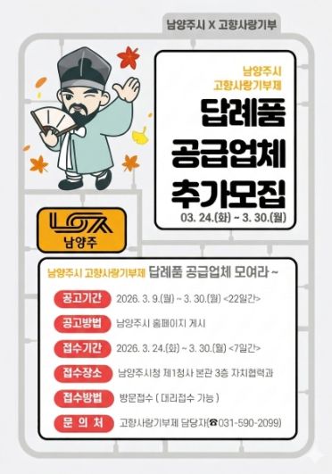 뉴한국방송뉴스통신사 신유철기자 기자 | 남양주시는 오는 3월 24일부터 고향사랑기부제 참여자들에게 제공할 ‘2026년 고향사랑기부제 답례품 공급업체’ 추가 모집 접수를 시작한다고 6일 밝혔다.