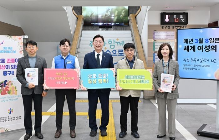 이날 행사에는 김제선 중구청장을 비롯해 이정만 공무원노동조합 위원장, 유우준 공무직노동조합 위원장이 나란히 참여했다. 이들은 출근하는 직원들과 일일이 따뜻한 아침 인사를 나누며, 서로 존중하는 일터 만들기에 동참해 줄 것을 독려해 활기찬 아침 분위기를 조성했다.