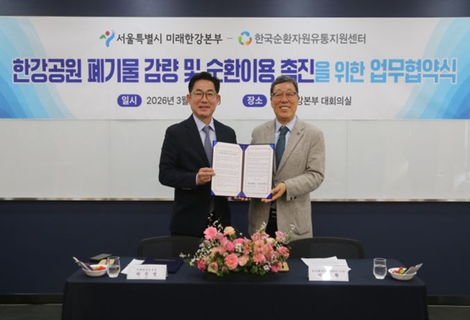 뉴한국방송뉴스통신사 신유철기자 기자 | 서울시 미래한강본부가 12일 한강공원 내 폐기물 감량 및 순환이용 촉진을 위해 폐기물 재활용 분야 전문기관인 한국순환자원유통지원센터(KOrea Resource circulation service Agency, KORA)와 업무협약을 체결했다.
