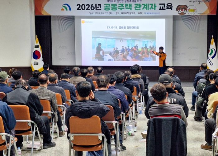 뉴한국방송뉴스통신사 신태공 기자 | 대전 대덕구는 17일 구청 청렴관에서 공동주택 경비책임자와 시설물 안전관리자 등 100여 명을 대상으로 ‘2026년 공동주택 관계자 교육’을 진행했다.