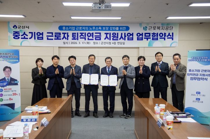 군산시는 17일 군산시청에서 근로복지공단과 ‘중소기업 근로자 퇴직연금 지원사업’ 추진을 위한 업무협약을 체결했다고 밝혔다. 이날 협약식에는 김영민 군산시장 권한대행과 성헌규 근로복지공단 의료복지이사를 비롯한 양 기관 관계자들이 참석했다.