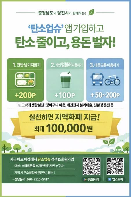 뉴한국방송뉴스통신사 신태공 기자 | 당진시는 기후위기 대응을 강화하고 시민들의 자발적인 탄소중립 실천을 확산하기 위해 충남형 탄소중립포인트제 ‘탄소업슈’ 가입자 확대를 본격 추진한다고 19일 밝혔다.
