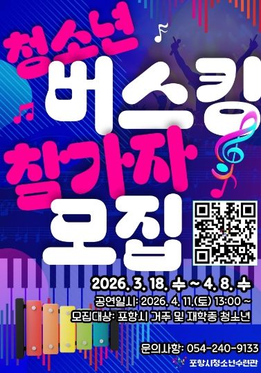 뉴한국방송뉴스통신사 신유철기자 기자 | 포항시청소년재단 청소년수련관은 내달 8일까지 청소년들이 자신의 끼와 재능을 마음껏 펼칠 수 있는 무대인 ‘청소년 버스킹’ 참가자를 모집한다.