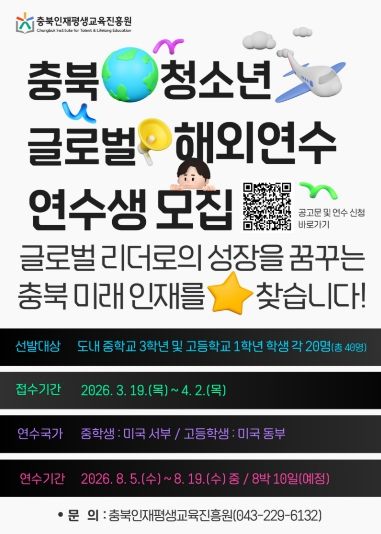 뉴한국방송뉴스통신사 권영분기자 기자 | 충북인재평생교육진흥원은 도내 중·고생 총 40명을 대상으로 ‘2026년 충북 청소년 글로벌 해외연수’에 함께할 연수생을 모집한다.