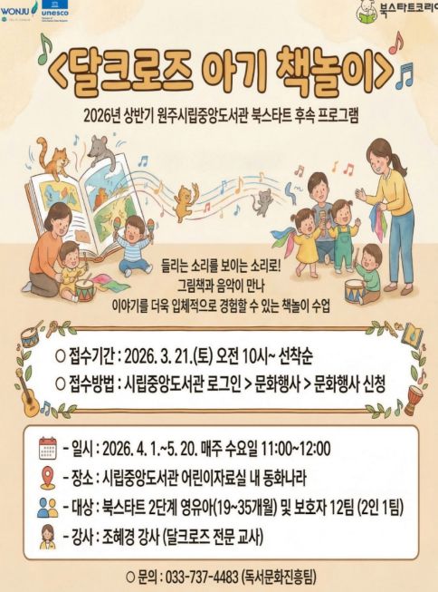 뉴한국방송뉴스통신사 양호선기자 기자 | 원주시립중앙도서관은 유아의 오감 및 정서 발달을 돕기 위해 2026년 상반기 북스타트 후속 프로그램 ‘달크로즈 아기 책놀이’를 운영한다.