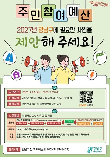 뉴한국방송뉴스통신사 신유철기자 기자 | 꿈이 모이는 도시, 미래를 그리는 강남구가 2027년도 예산편성에 반영할 주민참여예산 제안사업 공모를 3월 23일부터 7월 15일까지 진행한다. 올해 공모 규모는 총 13억 원으로, 주민이 직접 생활 속 불편을 해결하고 지역에 필요한 사업을 제안해 예산에 반영하는 참여형 제도다.