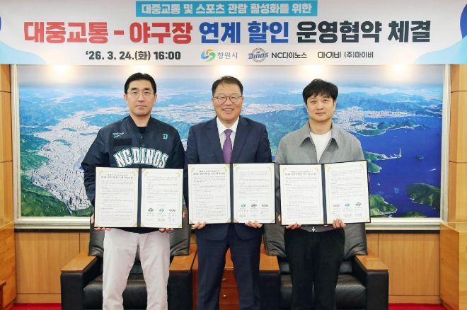 뉴한국방송뉴스통신사 신유철기자 기자 | 창원특례시와 NC 다이노스, ㈜마이비는 24일 창원시청에서 시내버스-야구장 연계 할인 서비스 제공을 위한 업무협약을 체결했다.
