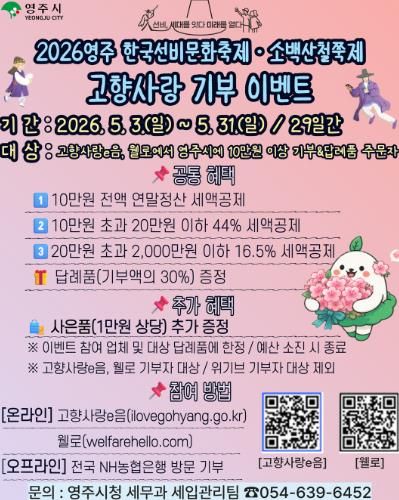 뉴한국방송뉴스통신사 신유철기자 기자 | 영주시는 5월 개최되는 '2026 영주 한국선비문화축제'와 '소백산철쭉제'를 맞아 고향사랑기부제 참여 확대를 위한 특별 이벤트를 운영한다.