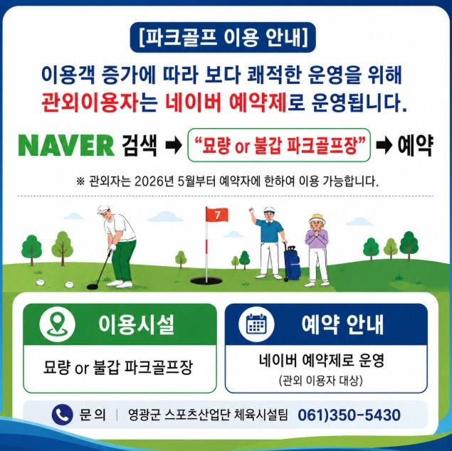 영광군 관계자는 “묘량불갑 파크골프장은 자연속에서 누구나 쉽게 즐길 수 있는 생활체육 공간”이라며, “체계적인 예약 운영과 지속적인 잔디 관리를 통해 이용만족도를 높이고 지역 관광 활성화에도 기여할 것으로 기대한다”고 밝혔다.