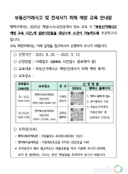 교육 신청은 정보무늬(QR코드)를 이용해 오는 9월 12일까지 접수할 수 있으며, 우편 및 사회관계망(SNS) 안내와 함께 평택시 누리집에도 신청 방법을 게시했다.