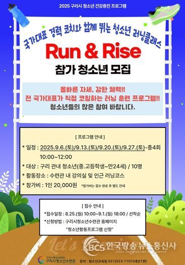 뉴한국방송뉴스통신사 신유철기자 기자 | 구리시청소년재단 청소년수련관은 청소년들의 신체 건강 증진과 자기 주도적인 삶의 태도 형성을 위한 체험형 체력 증진 프로그램 ‘청소년 러닝클래스 Run & Rise’를 오는 9월 한 달간 운영한다.