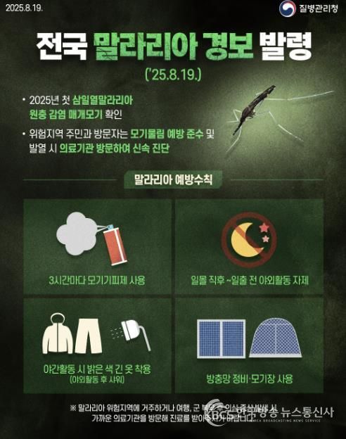 이번 경보는 2025년 국내 첫 삼일열말라리아 원충이 매개모기(얼룩날개모기류)에서 확인됨에 따라 발령된 것으로, 매개모기에 물렸을 때 말라리아에 감염될 가능성이 높아졌음을 의미한다.