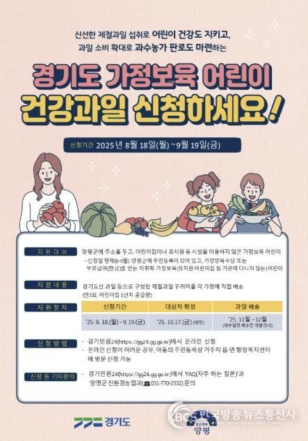 뉴한국방송뉴스통신사 신유철기자 기자 | 양평군은 8월 18일부터 9월 19일까지 ‘2025년 가정 보육 어린이 건강과일 공급사업’ 신청을 접수한다고 밝혔다.