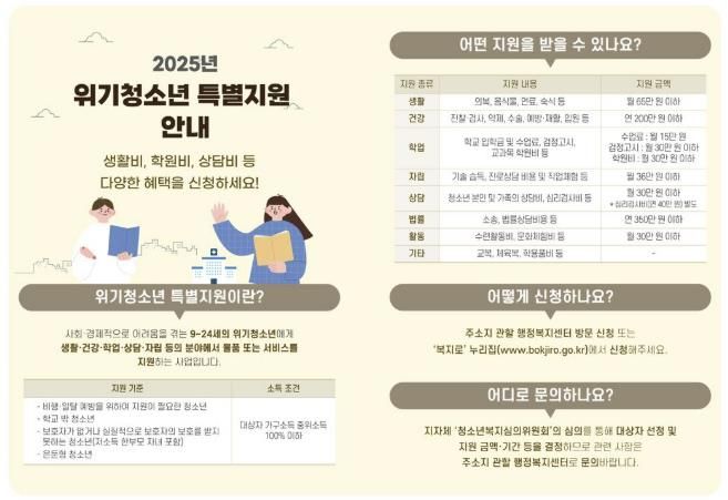 뉴한국방송뉴스통신사 신유철기자 기자 | 가평군이 사회‧경제적 어려움에 처한 위기청소년을 대상으로 특별지원 신청을 9월 30일까지 받고 있다. 이번 지원은 '청소년복지지원법' 제14조에 근거해 추진되는 것으로, 보호자가 없거나 실질적 보호를 받지 못하는 청소년과 저소득 한부모 가정 자녀 등이 주요 대상이다.