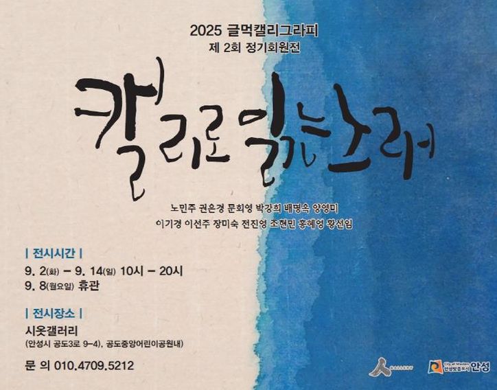 뉴한국방송뉴스통신사 신유철기자 기자 | 안성시 시옷갤러리에서 오는 9월 2일부터 9월 14일까지 글먹캘리그라피 동아리의 두 번째 단체전 ‘캘리로 읽는 노래’가 열린다. 이번 전시는 일상 속에서 누구나 흥얼거리게 되는 노랫말을 감성적인 캘리그라피 작품으로 풀어낸다.
