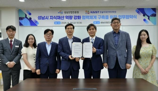 뉴한국방송뉴스통신사 신유철기자 기자 | 성남산업진흥원과 KAIST 문술미래전략대학원은 8월 29일 성남산업진흥원 7층 회의실에서 ‘성남시 지식재산 역량 강화 협력체계 구축을 위한 업무협약’을 체결했다.