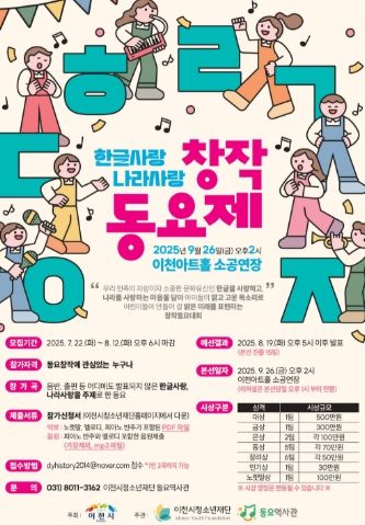 뉴한국방송뉴스통신사 신유철기자 기자 | 이천시는 오는 9월 26일 오후 2시 이천아트홀 소공연장에서 ‘한글사랑 나라사랑 창작동요제’를 개최한다. 이번 행사는 우리말의 소중함을 되새기고 나라사랑의 정신을 기리기 위해 마련됐다.