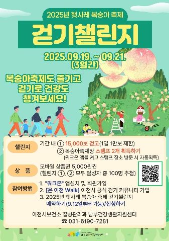 이천시보건소 관계자는 “향긋한 장호원 황도가 무르익는 가을을 맞아 복숭아 축제도 즐기고 걷기 챌린지에 참여해 건강도 챙기시길 바란다”라고 전하며, “이번 걷기 챌린지를 통해 시민들이 건강한 생활 습관을 실천하고 지역 축제에 관심과 참여를 높이는 계기가 될 것으로 기대한다”라고 말했다.