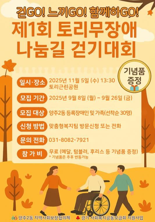 행사는 오는 11월 5일 오후 1시 30분, 토리근린공원 무장애 나눔길에서 열리며, 양주2동 등록 장애인과 그 가족을 대상으로 선착순 30명을 모집한다. 접수는 양주2동 맞춤형복지팀 방문 또는 전화로 가능하다.