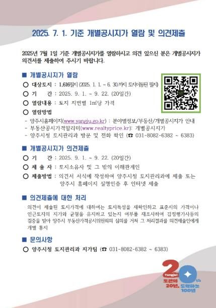 뉴한국방송뉴스통신사 신유철기자 기자 | 양주시는 9월 1일부터 9월 22일까지 2025년 7월 1일 기준 개별공시지가 열람과 의견제출을 받는다.