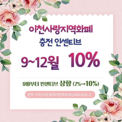 뉴한국방송뉴스통신사 신유철기자 기자 | 이천시는 지역경제 활성화와 소상공인 매출 증대를 위해 오는 9월부터 12월까지 경기이천사랑 지역화폐 인센티브를 10%로 상향 지원한다고 밝혔다.