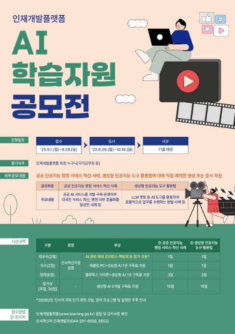 인사혁신처는 공무원의 인공지능 활용 역량을 높이고, 공직 내 학습 문화를 확산하기 위해 ‘인재개발플랫폼 인공지능 학습자원 공모전’을 개최한다고 1일 밝혔다.