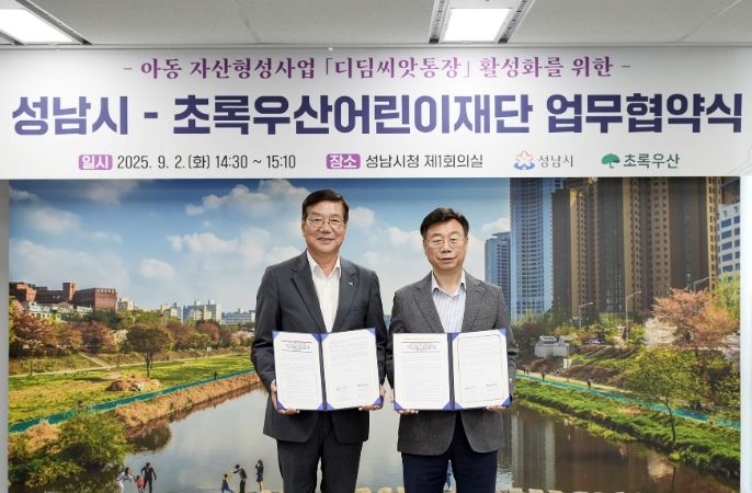 시는 9월 2일 오후 2시 30분 시청 4층 제1회의실에서 신상진 성남시장과 황영기 초록우산 어린이재단 회장 등이 참석한 가운데 ‘아동 자산 형성 지원사업, 디딤씨앗통장 활성화를 위한 업무 협약’을 했다.