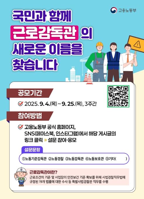 뉴한국방송뉴스통신사 신유철기자 기자 | 고용노동부는 9월 4일부터 9월 25일까지 약 3주간 ‘근로감독관’의 새로운 명칭을 공모한다고 밝혔다.