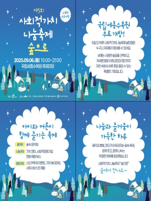 뉴한국방송뉴스통신사 신유철기자 기자 | 한국사회적기업진흥원은 오는 9월 6일 15시부터 21시까지 국립세종수목원 축제마당에서'제5회 사회적가치 나눔축제, 숲으로'를 공동 개최한다.