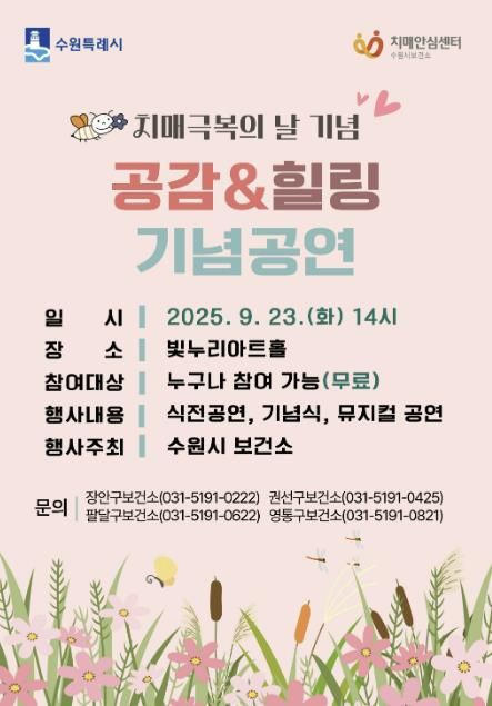 뉴한국방송뉴스통신사 신유철기자 기자 | 수원시보건소가 치매극복의 날을 기념해 9월 23일 오후 2시 빛누리아트홀에서 ‘공감·힐링 기념 공연’을 개최한다.