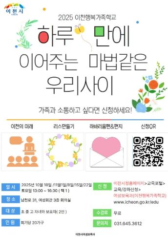 프로그램 신청은 9월 8일부터 이천시 누리집에서 가능하며, 선착순 100가족을 대상으로 한다. 교육은 10월 18일부터 11월 22일까지 13시부터 16:30분까지 매주 토요일 5회 진행되며, 기타 자세한 내용은 이천시 누리집 ' 교육포털 ' 교육/강좌 신청을 참고하면 된다.