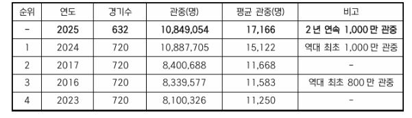 뉴한국방송뉴스통신사 신유철기자 기자 | KBO 리그가 단일 시즌 역대 최다 관중 신기록 수립을 눈앞에 두고 있다. 9월 4일(목)까지 KBO 리그는 632경기만에 1,084만 9,054명의 관중이 야구장을 찾아 기존 단일 시즌 최다 관중 기록이었던 2024시즌의 1,088만 7,705명에 3만 8,651명을 남겨 뒀다. 출범 첫 시즌이었던 1982년 총 143만 8,768명의 관중으로 시작했던 KBO 리그는 마흔 네번째 시즌 만에 2년 연속 1,000만 관중을 넘어서는 프로스포츠 리그로 성장했다.