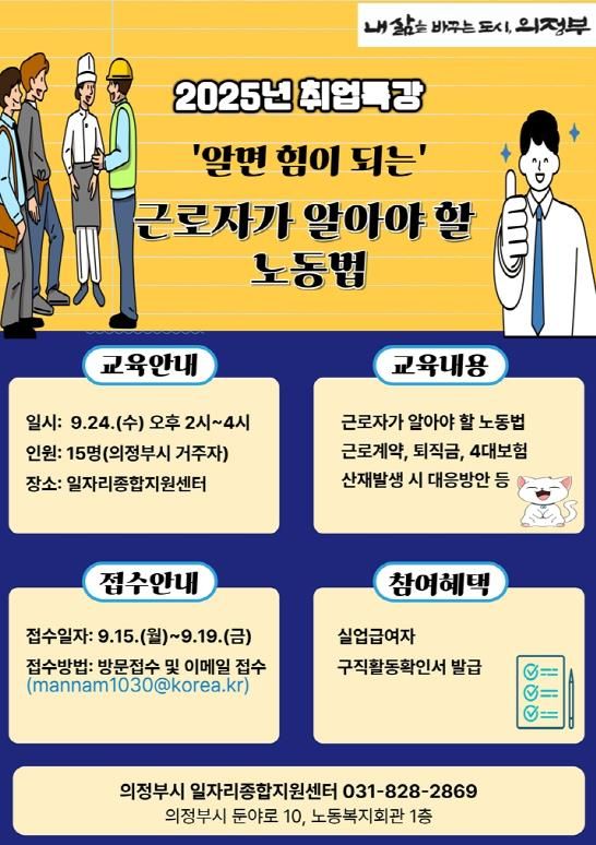 뉴한국방송뉴스통신사 신유철기자 기자 | 의정부시는 구직자들의 안정적인 취업활동을 돕기 위해 9월 24일 오후 2시부터 4시까지 일자리종합지원센터 다목적실에서 ‘근로자가 알아야 할 노동법’ 취업특강을 진행한다.