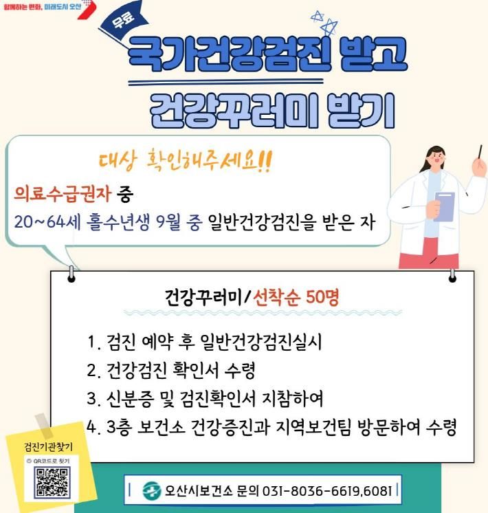 뉴한국방송뉴스통신사 신유철기자 기자 | 오산시는 오산시보건소에서 의료급여수급권자의 건강권 보장을 위해 만 20세에서 64세 사이 홀수년도 출생자를 대상으로 하는 국가건강검진 참여를 적극 독려한다고 밝혔다. 또한 9월 중 검진을 완료한 선착순 50명에게는 ‘건강꾸러미’를 제공할 예정이다.