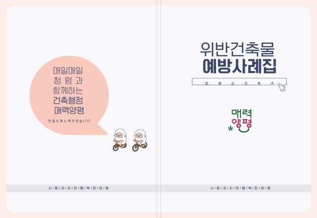전진선 양평군수는 “이번 사례집을 통해 군민들의 건축법 이해도가 높아져 위반건축물 발생을 예방하고, 재산권 피해를 최소화할 수 있을 것으로 기대한다”며, “앞으로도 군민 눈높이에 맞는 다양한 홍보자료를 제작해 건축행정서비스의 질을 높이고, 안전하고 쾌적한 양평군의 건축문화 조성에 최선을 다하겠다”고 밝혔다.