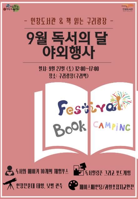 뉴한국방송뉴스통신사 신유철기자 기자 | 구리시 인창도서관은 9월 독서의 달을 맞아 오는 9월 27일 오후 12시부터 5시까지, 시민 누구나 참여할 수 있는 야외 독서문화 행사 『책 읽는 구리광장』을 운영한다고 밝혔다.