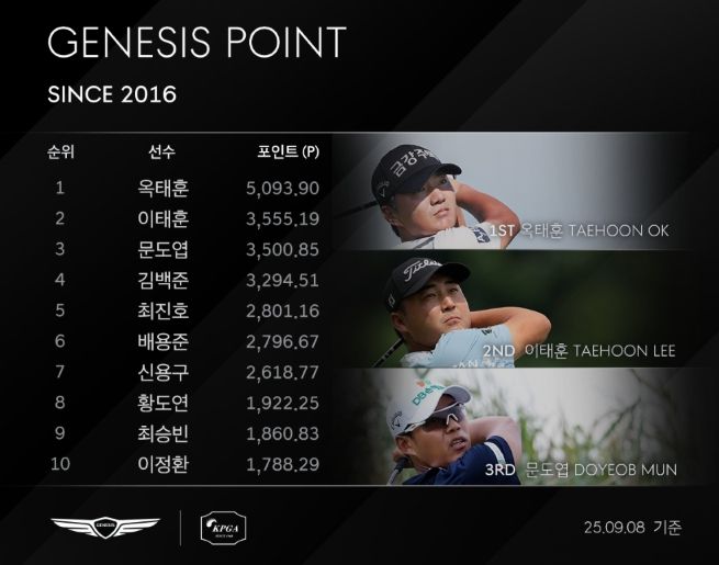 한편 시즌 종료 후 ‘제네시스 대상’을 수상한 선수에게는 보너스 상금 2억 원과 함께 제네시스 차량, PGA투어 큐스쿨 최종전 직행 자격, KPGA 투어 시드 5년, DP월드투어 시드 1년이 주어진다. 2026년 ‘제네시스 스코티시 오픈’ 출전권도 부여된다.
