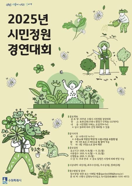 뉴한국방송뉴스통신사 신유철기자 기자 | 수원시는 9월 22일까지 ‘2025년 시민정원 경연대회’에 참가할 시민을 모집한다.