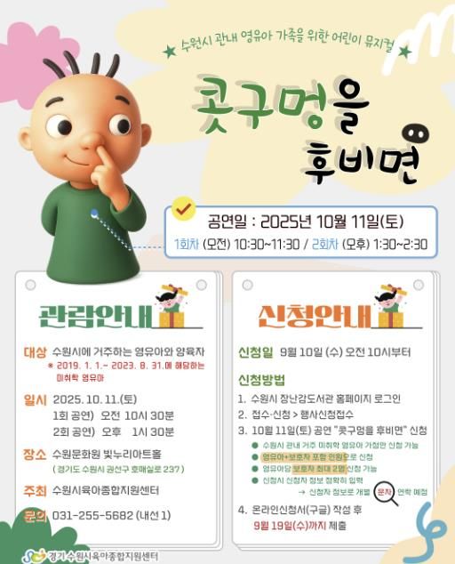 뉴한국방송뉴스통신사 신유철기자 기자 | 수원시육아종합지원센터는 추석 연휴를 맞아 10월 11일 수원시 빛누리아트홀에서 어린이 뮤지컬 ‘콧구멍을 후비면’을 상연한다.