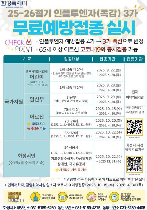 정명근 화성특례시장은 “독감 예방접종은 어르신과 어린이, 임신부 등 고위험군의 건강을 지키는 가장 효과적인 수단”이라며 “시민들께서 올 겨울 유행에 대비해 예방접종에 적극 참여해 주시길 바란다”고 당부했다.