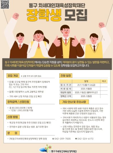 뉴한국방송뉴스통신사 신태공 기자 | 대전 동구는 이달 15일부터 26일까지 2주간 지역 고등학생을 대상으로 ‘2025년도 차세대인재육성장학재단 장학생 모집’을 실시한다고 11일 밝혔다.