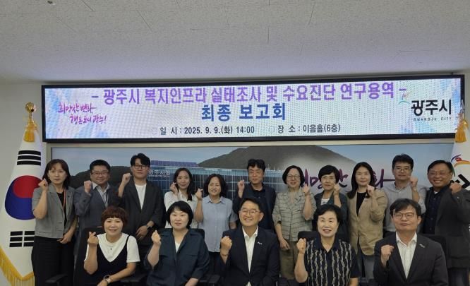 뉴한국방송뉴스통신사 신유철기자 기자 | 광주시는 지난 9일 시청 이음홀에서 사회복지단체·시설장 및 관계 공무원 등 20여 명이 참석한 가운데 ‘2025년 광주시 복지인프라 실태 조사 및 수요 진단 연구용역’ 최종 보고회를 개최했다.