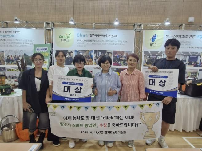뉴한국방송뉴스통신사 신유철기자 기자 | 양주시는 지난 11일 경기도농업기술원에서 열린 ‘2025년 경기도 농업인 스마트경영 혁신대회’에 참가한 양주시사이버농업인연구회가 스마트콘텐츠(고령) 분야와 스마트경영(개인) 분야에서 각각 대상을 수상했다고 밝혔다.